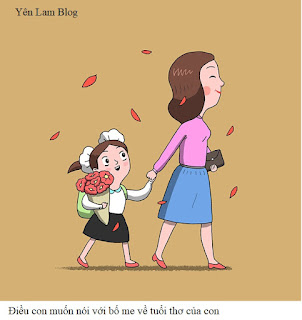 Ngày đầu của con bước vào lớp 1, với biết bao cảm xúc nhưng bố mẹ không hiểu đâu, bố mẹ chỉ hỏi con hôm nay đi học thế nào, cô có mắng con không? con chơi với bạn nào? con thì kể hết mọi chuyện cho bố mẹ nghe, kể đến cả con bướm bay qua cửa sổ cả lớp ồn ào méc cô, cả những chuyện bạn Na quên mang bút chì, con cho bạn ấy mượn vì con ngồi gần bạn ấy. Đêm về con được ru trong giấc ngủ với biết bao hình ảnh của lớp 1 hôm nay cùng con đi vào giấc mơ, con mỉm cười vì hình ảnh của bạn Na cứ mãi trong tâm trí con. Bố mẹ có biết không con có nhiều điều muốn nói, muốn kể cho bố mẹ nghe lắm, nhưng giờ con buồn ngủ rồi. Ngày mai con kể tiếp nhé, con không biết ngày mai những gì đang đón đợi con, con sẽ đến lớp đến khi nào mới thôi hả mẹ? Con muốn kể cho bố mẹ nhiều thật nhiều nhưng mà bố mẹ đâu có chịu dành thời gian để nói chuyện với con. Bố bận cầm điện thoại làm việc, mẹ bận công việc nhà. Con chỉ biết để dành lại cho riêng mình, con ước là bố mẹ chơi với con nhiều hơn, nhưng thôi không sao, ngày mai đến lớp con chơi với bạn Na cũng được.