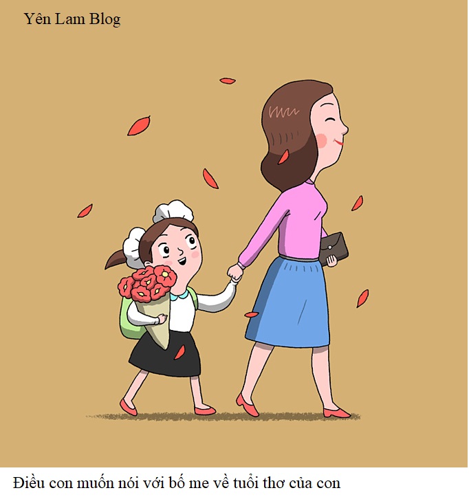 Con là Bi năm nay con tròn 6 tuổi, con vừa bước vào lớp 1. Con có rất nhiều điều muốn nói với bố mẹ. Ngày con chào đời, con biết bố mẹ rất mừng vui. Con biết mình đã rất may mắn được là con của bố mẹ. Mỗi ngày con được lớn lên trong tình thương của bố mẹ, con luôn được xem là tâm điểm là niềm vui của cả gia đình mình. Nhưng bố mẹ có biết không, vì con chỉ biết nằm và biết lăn, con không biết nói, biết thể hiện niềm vui, và những cái con không thích. Nhưng bố mẹ không tinh ý nhận ra, bố mẹ cứ thấy con cười khanh khách là bố mẹ cứ tưởng con đang vui. Trong suốt từng năm con lớn thêm 1 tuổi, bố mẹ vui mừng tổ chức sinh nhật cho con cùng bạn bè của bố mẹ. Rồi đến khi con bước vào nhà trẻ, ngày đầu đến lớp con nghe bố mẹ nói chuyện với nhau là sẽ đưa con đi nhà trẻ. Con đâu hiểu được nhà trẻ là gì? nơi đó có những gì đang chờ con. Rồi bố mẹ lừa con vào lớp, vội bỏ con lại với môi trường xa lạ, xung quanh toàn người xa lạ. Con sợ sệt và con khóc, 1 ngày trôi qua đối với con là cả một nỗi cô đơn, con không biết bố mẹ có quay lại đón con không? con ở đây với bạn và cô giáo mới, đồ chơi mới nhưng con không muốn ai đến gần. Con chỉ muốn về với bố mẹ thôi.